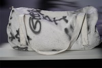 Spacious canvas duffel with rounded sides and a soft black fleece lining for added strength and comfort. Designed roomy and flexible for everyday carry, travel, or studio runs. Features a smooth chrome nylon coil zipper for comfortable use and a custom zipper head for a subtle signature detail. Available in small, medium, and large. Hand spray-painted or clean blank options. Built to move how you move.